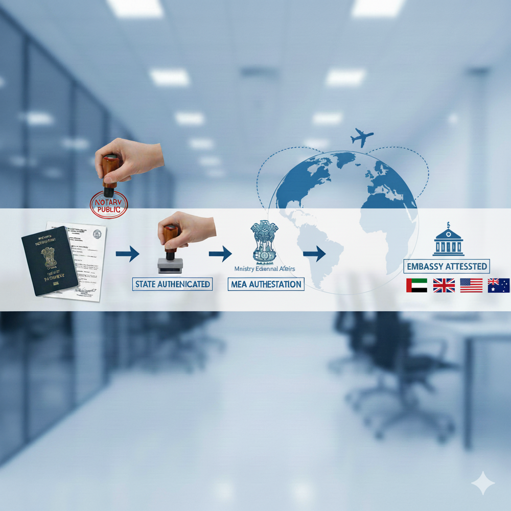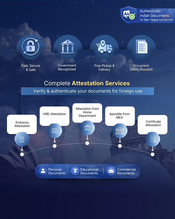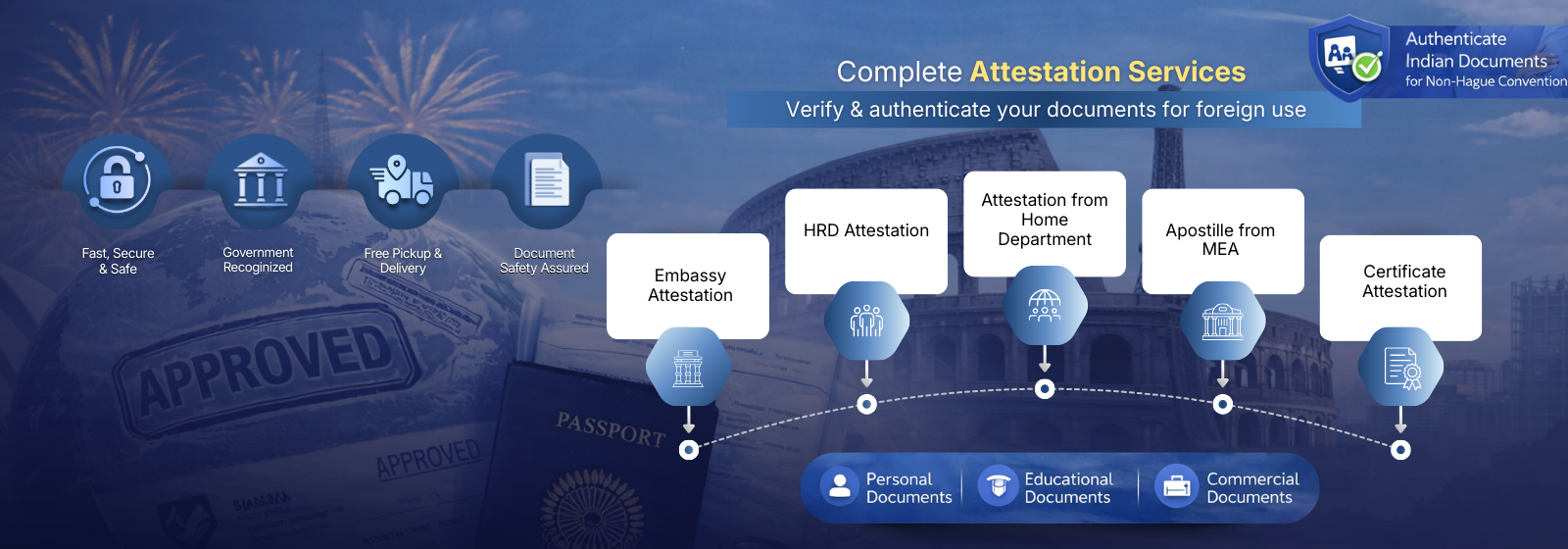 Attestation is the process of verifying and authenticating Indian documents for use in foreign countries. It is required to prove the authenticity of personal, educational, or commercial documents where Apostille is not applicable or for countries that are non-Hague Convention members. Attestation ensures that your documents are legally recognized abroad.