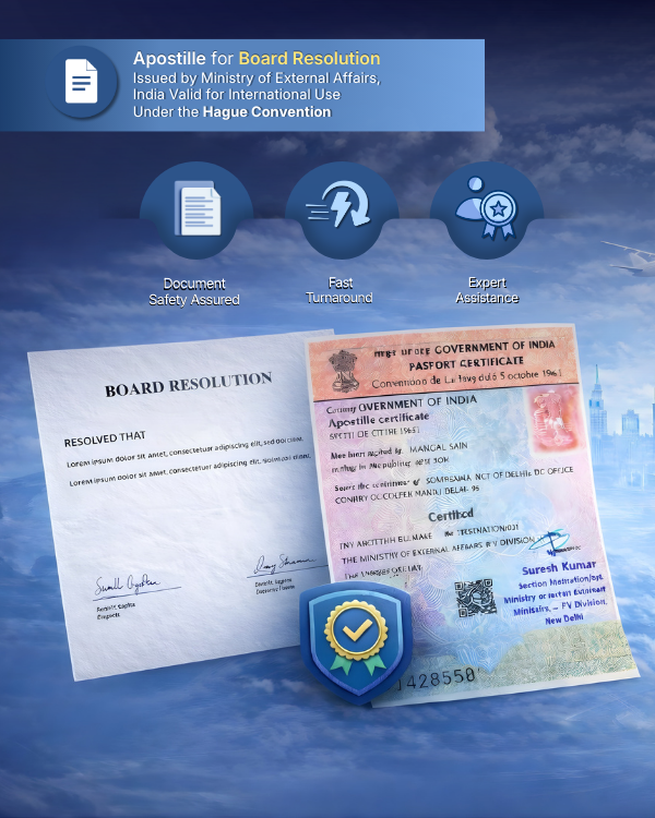 A Board Resolution Apostille is the legalization of a company’s official board decision document by the Ministry of External Affairs (MEA), India, making it valid and acceptable in all Hague Convention countries. It certifies that the resolution passed by the company’s Board of Directors is genuine and legally recognized abroad.