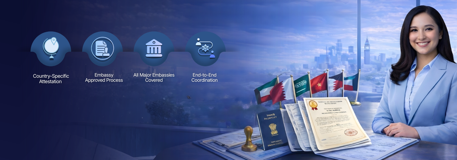 Embassy Attestation is the process of getting your documents verified by the Embassy or Consulate of the country where you are planning to study, work, marry, or settle. Embassy Attestation is required for non-Hague countries such as UAE, Saudi Arabia, Qatar, Kuwait, Oman, China, Egypt, Vietnam, etc.