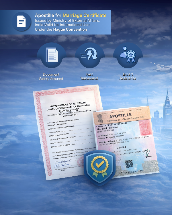 A Marriage Certificate Apostille is the process of legalizing your marriage certificate so it is valid in all Hague Convention member countries. The Apostille is issued by the Ministry of External Affairs (MEA), India, and confirms that your marriage certificate is genuine and acceptable abroad.