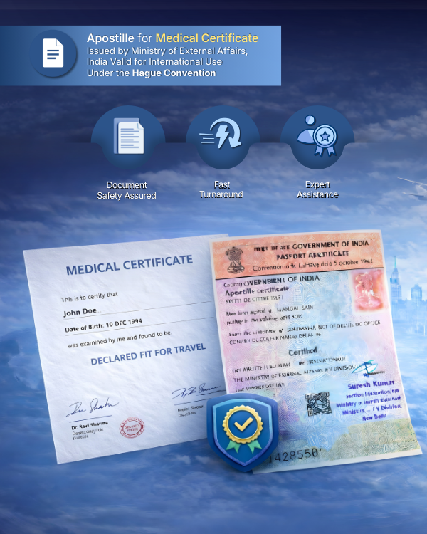 A Medical Certificate Apostille is the process of legalizing a medical certificate by the Ministry of External Affairs (MEA), India, making it valid for use in Hague Convention member countries. It confirms that the medical certificate is genuine and issued by a recognized doctor or hospital.