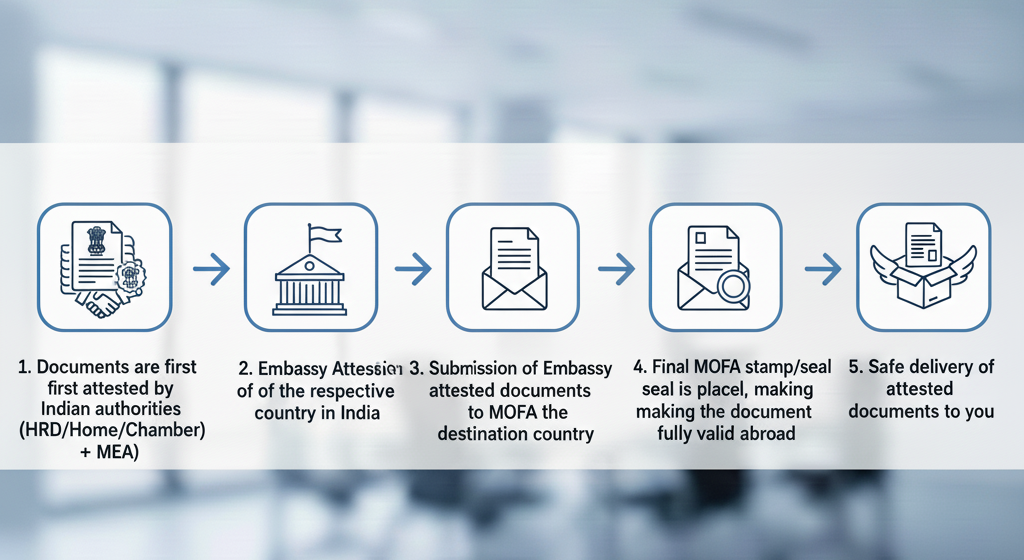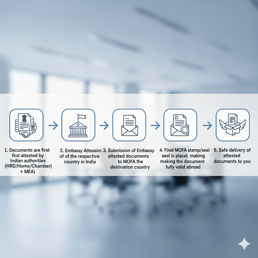 - 1 Documents are first attested by Indian authorities (HRD/Home/Chamber + MEA).