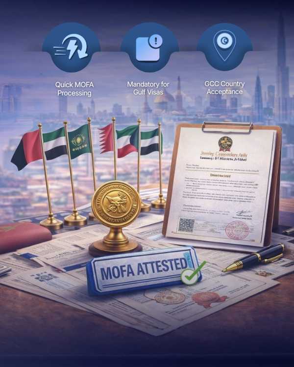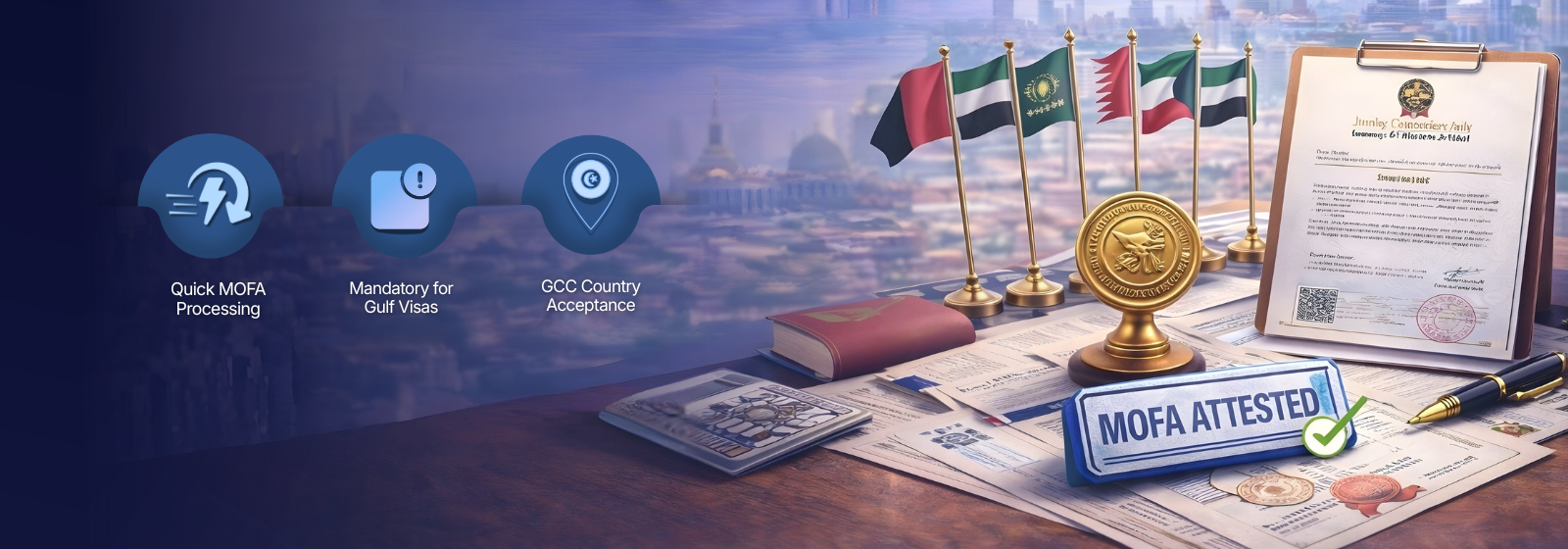 MOFA Attestation is the final step of document legalization, done by the Ministry of Foreign Affairs (MOFA) in the destination country (for example: UAE, Saudi Arabia, Qatar, Kuwait, Oman, etc.). After your documents are attested by the Indian authorities (HRD/Home/Chamber + MEA + Embassy), they must be verified by MOFA abroad to be officially accepted for study, work, residence, or business purposes.